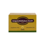 Gulguluthikthakam Kwath is a well-known Ayurvedic liquid supplement for joint pain and other inflammatory conditions including skin diseases. This herbal concoction is prepared with the oleo-resin gum Guggul that is well-known as a bio-enhancer and Panchatikta-the five bitter herbs- such as Neem and Guduchi that have powerful anti-inflammatory effects. It is used in treatment for gout and can be supplemented with external Ayurvedic Panchakarma treatments to provide good relief from joint pain. With a superior blend of pain-relieving herbs prepared according to the ancient Vedic recipe of Gulguluthikthakam ghee derived from the Ashtanga Hridaya, this herbal decoction maintains joint and skin health, lowers cholesterol levels, and is a powerful nervine tonic. It is also used in managing obesity, uterine fibroids and helps in the quicker healing of chronic ulcers. It is useful in treating Cervical and Lumbar spondylosis and other afflictions of bones and skin with associated vitiation of Kapha and Vata dosha. It gives symptomatic relief in skin afflictions like Psoriasis, hives, boils, scabies and dermatitis due to its ability to purify the blood, strengthen digestion and promote skin rejuvenation.