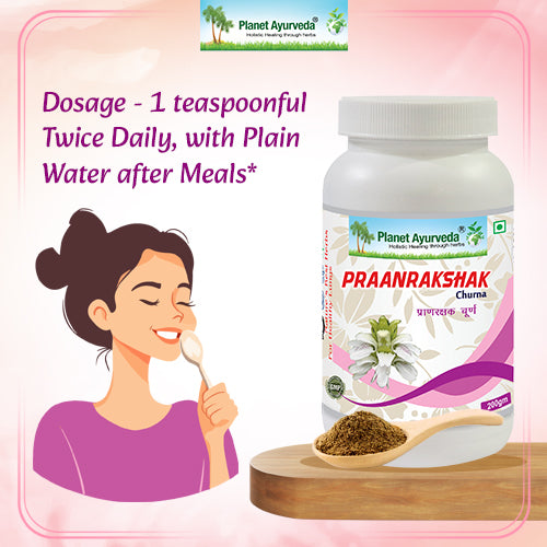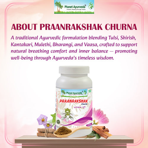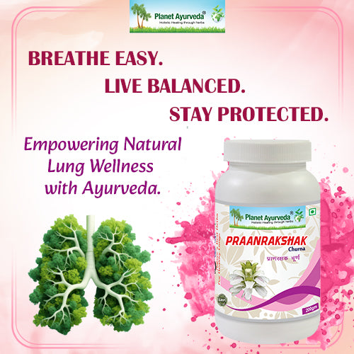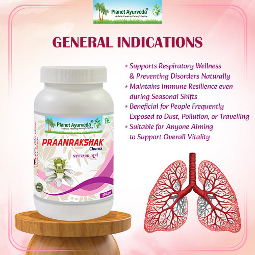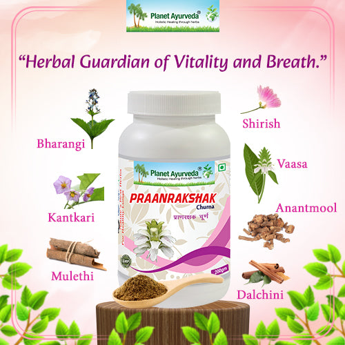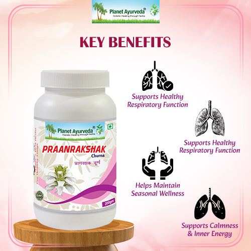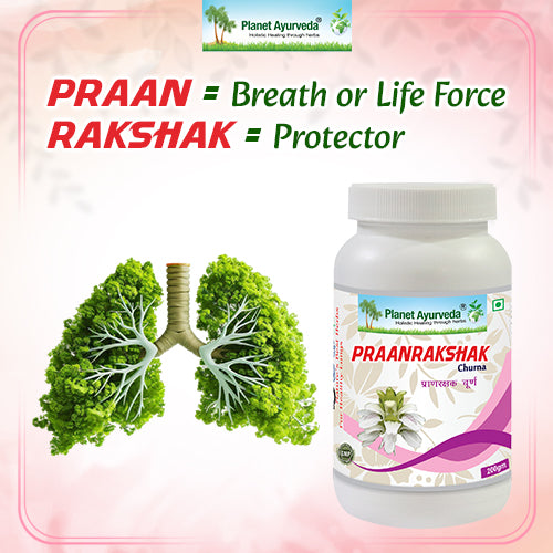 Praanrakshak Churna is an ayurvedic preparation prepared using vasa (Adhatoda vasica), Mulethi (Glycyrrhiza glabra), Shirish (Albizia lebbeck) and many more. As its name indicates it protects our Prana (Breathing) thus it is very good in managing disorders related to Respiratory system. Along with this, it also improves the functioning of lungs and supports healthy breathing.