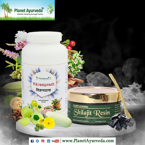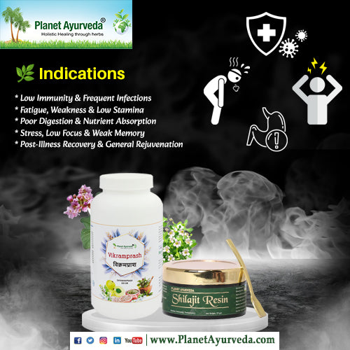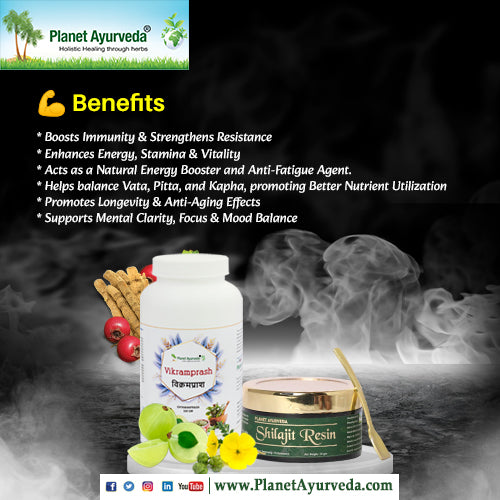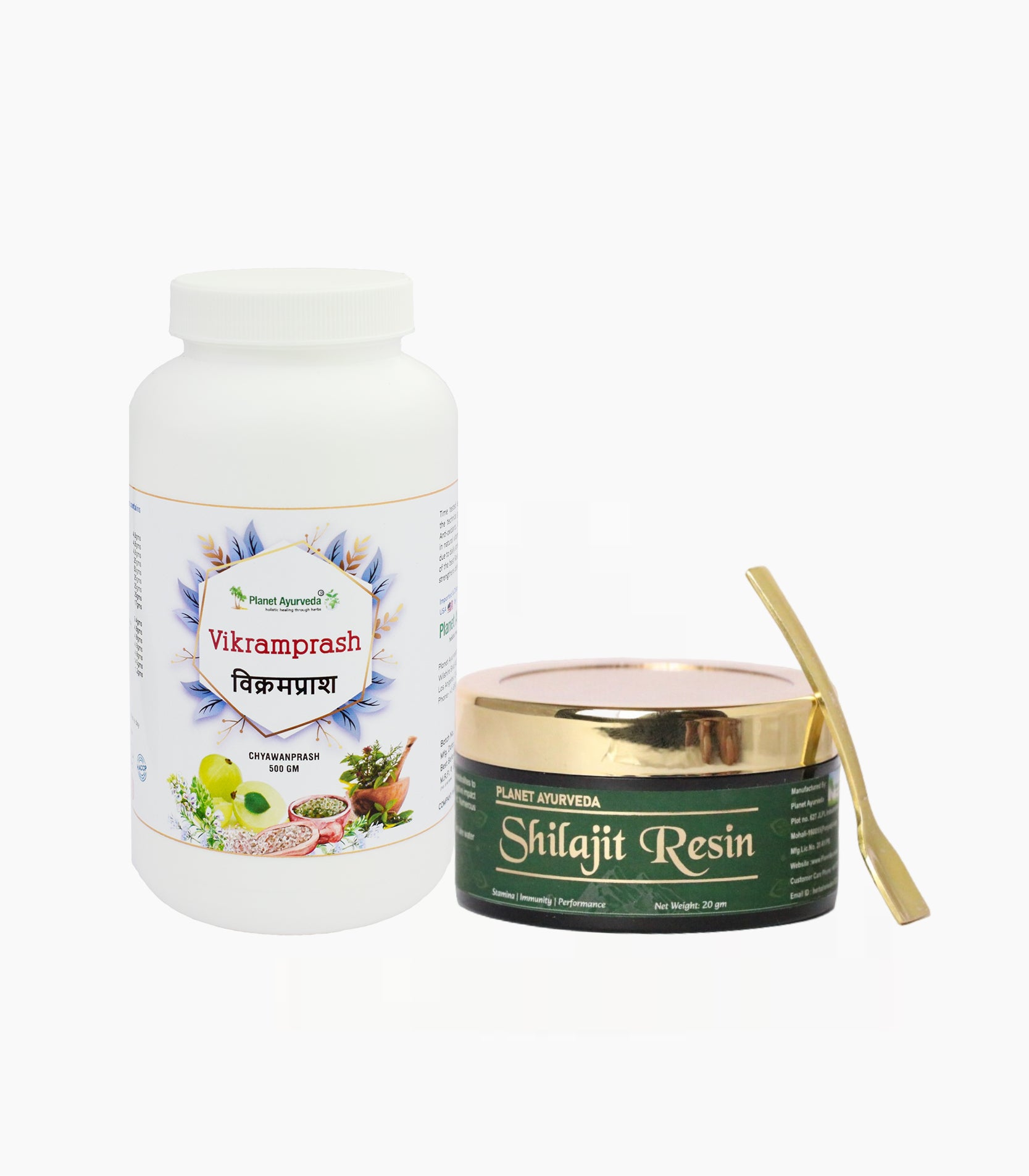 A Powerful Ayurvedic Duo for Holistic Well-being across all Ages, where Vikramprash Nourishes and Builds Immunity from Within, while Shilajit Resin Energizes and Strengthens at the Cellular Level.